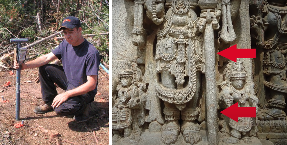 Another of his hands holds a long cylinder which resembles the tool modern engineers use known as a soil probe. This is put deep into the ground and taken out to find out what type of soil is there. There are records to prove that this was used on the soil before the construction of the great temple of Brihadeeswara in Tanjore. And obviously this must have been in use long before that which is how they were able to gauge the type of soil.